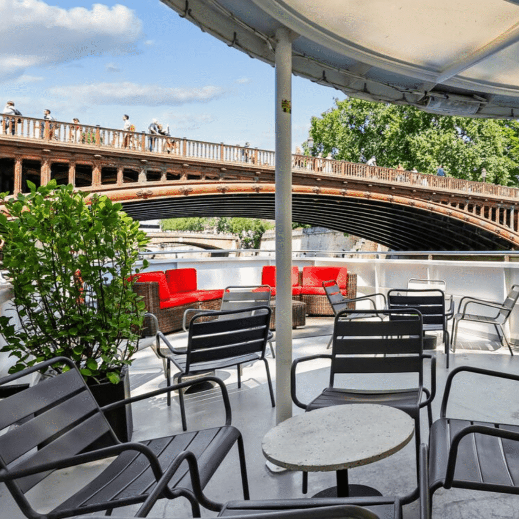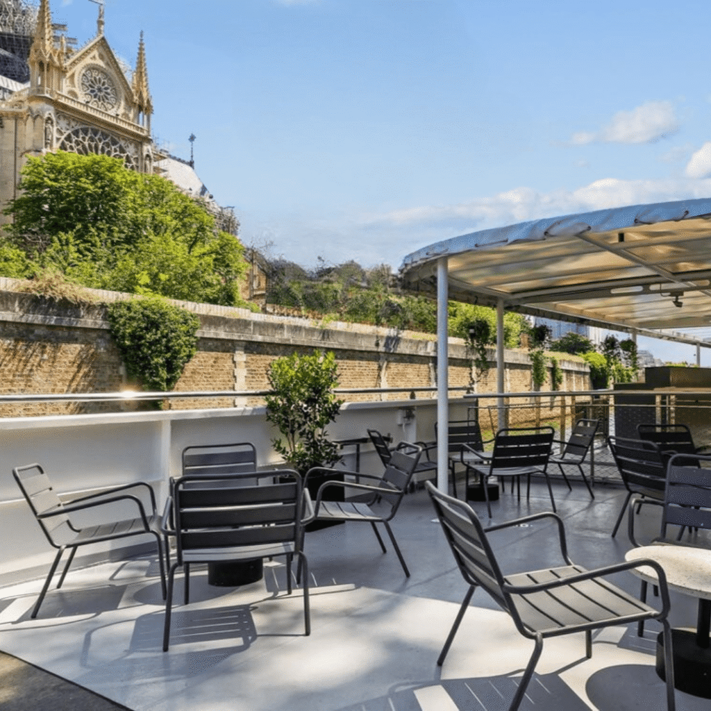 Le Bateau Ivre vous accueille dans un cadre prestigieux, avec un pont soleil entièrement aménagé offrant une vue exceptionnelle sur Notre-Dame. Un lieu idéal pour profiter d’un moment suspendu au cœur de Paris.