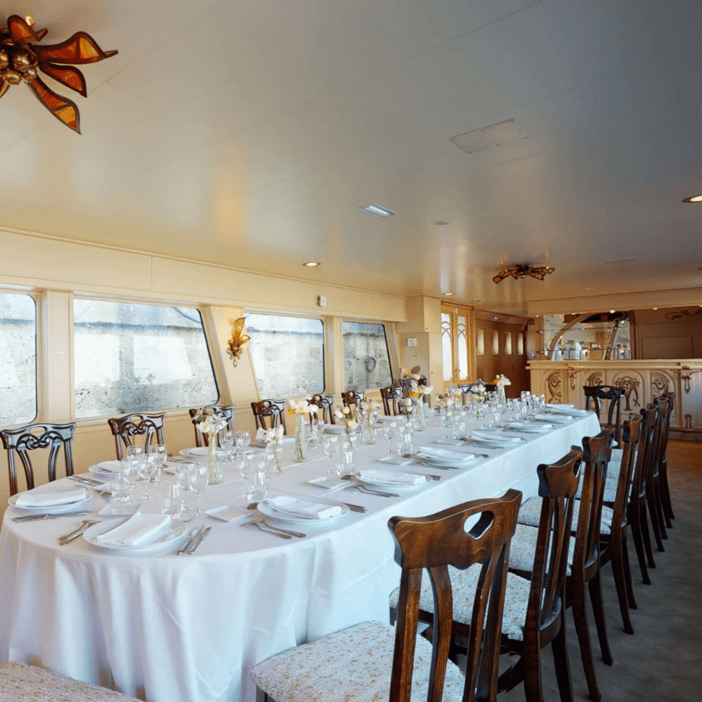 À l’intérieur, le pont principal révèle une décoration Belle Époque, mêlant charme d’antan et élégance intemporelle. Une atmosphère chaleureuse qui donne à vos événements une véritable touche de caractère.