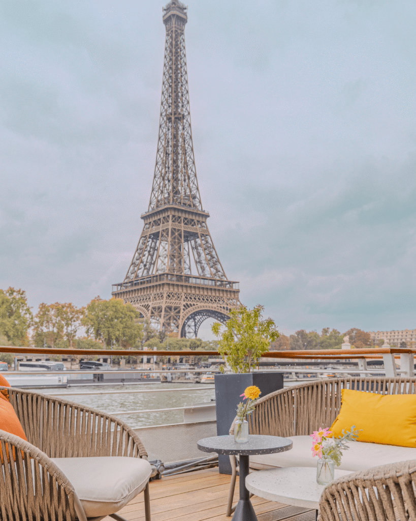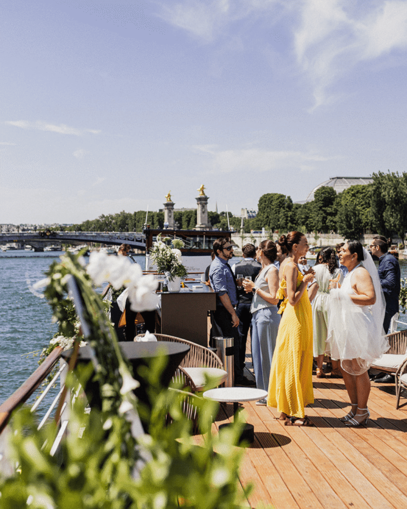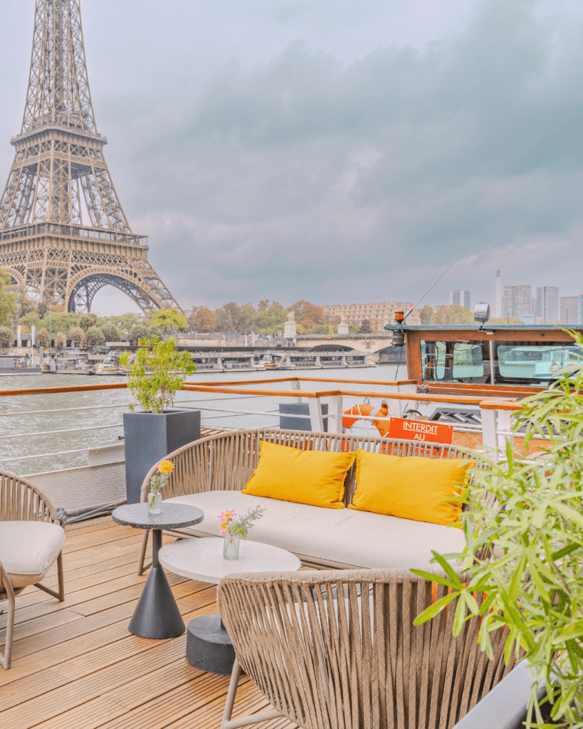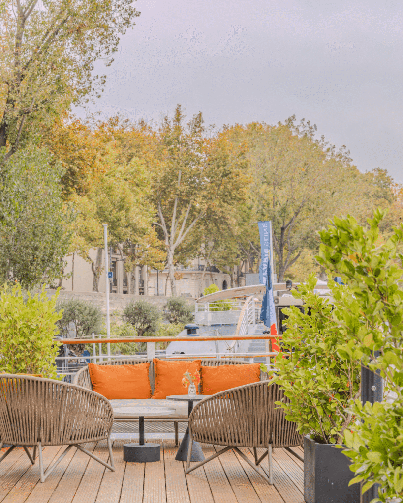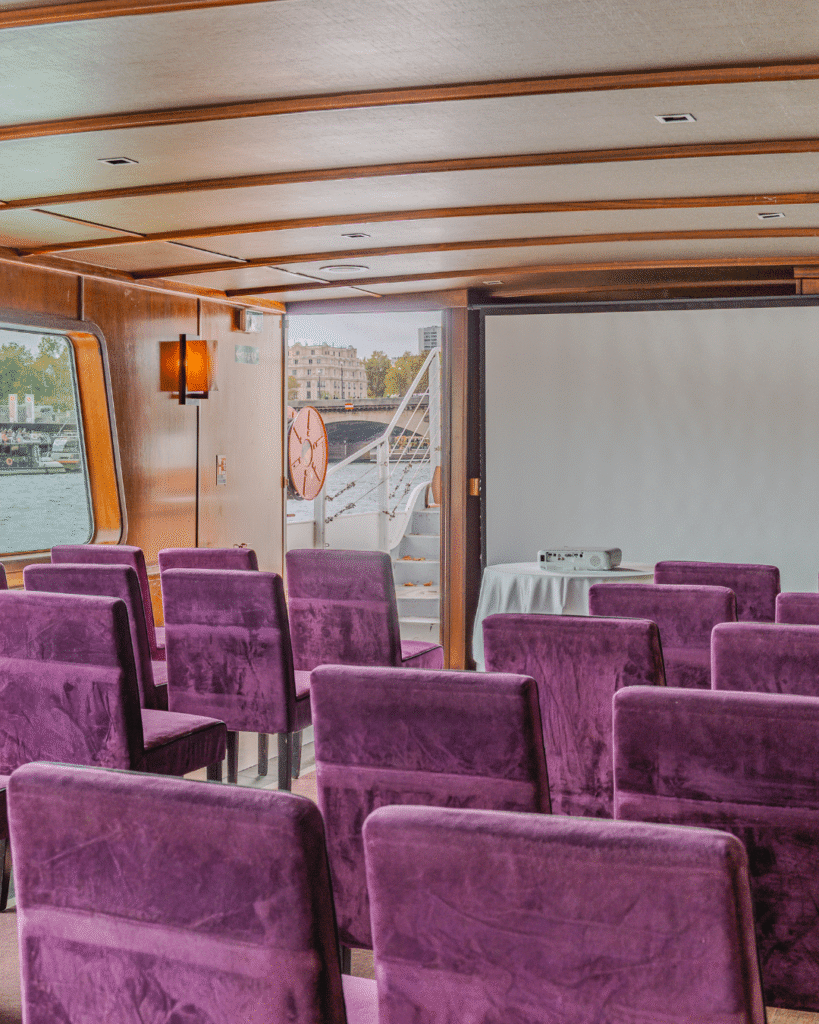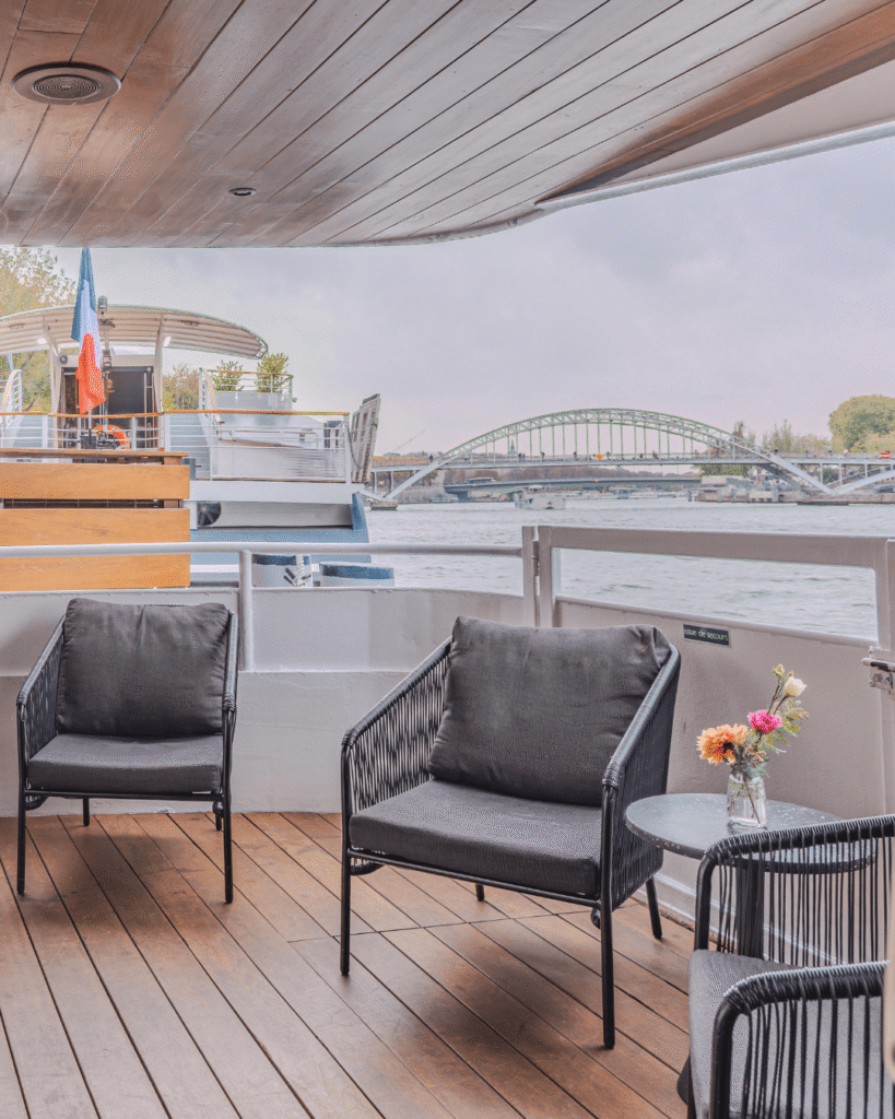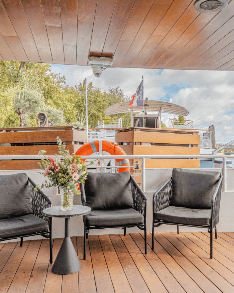 Une terrasse panoramique de 100 m² s’étend sur toute la longueur du bateau, offrant un point de vue privilégié pour profiter pleinement d’une croisière au cœur de Paris.