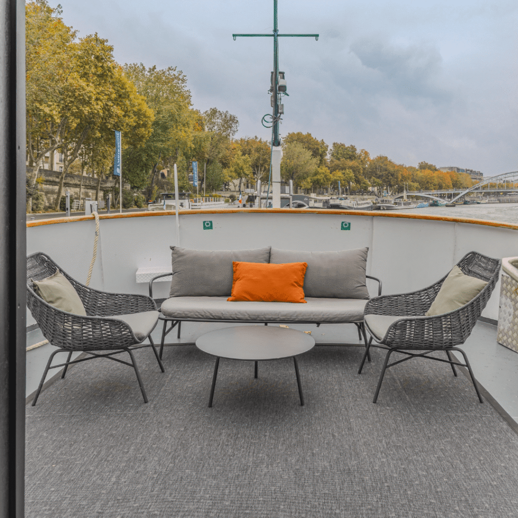 Trois terrasses entièrement aménagées et sonorisées, dont une protégée, vous offrent des points de vue privilégiés sur la Seine pour profiter pleinement de votre événement en plein air.